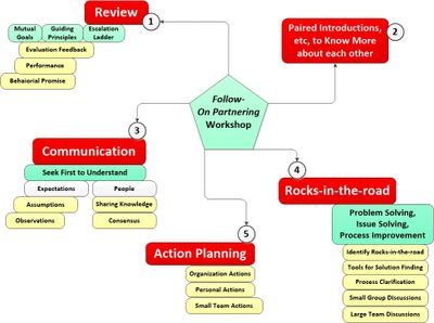 The Elements of the Initial Partnering Workshop include creating a Charter with the Vision/Mission, Guiding Principles and Mutual Goals. More importantly, the Team Members get to know one another better which engenders cooperation, collaboration and communication.